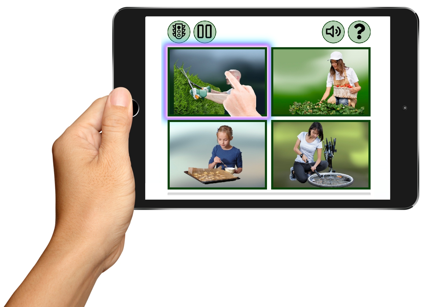 Anfänglich kann es notwendig sein, der Person mit Aphasie zu helfen, die richtigen Handlungen während des Programms auszuführen, aber mit der Zeit wird sie in der Lage sein, immer selbständiger an den Übungen teilzunehmen. Zu Beginn konzentriert sich das Programm nur auf die Produktion von Objekten, aber je nach Entwicklung und allgemeinem Sprachniveau der Person wird das Programm schließlich auch die Produktion von Verben und zum Schluss den vollständigen Satz (Subjekt-Verb-Objekt) umfassen. In jeder Therapiesituation werden vier neue Bilder verwendet. Es ist jedoch möglich, dieselben Bilder mehrmals zu verwenden, allerdings in unterschiedlichen Kombinationen.